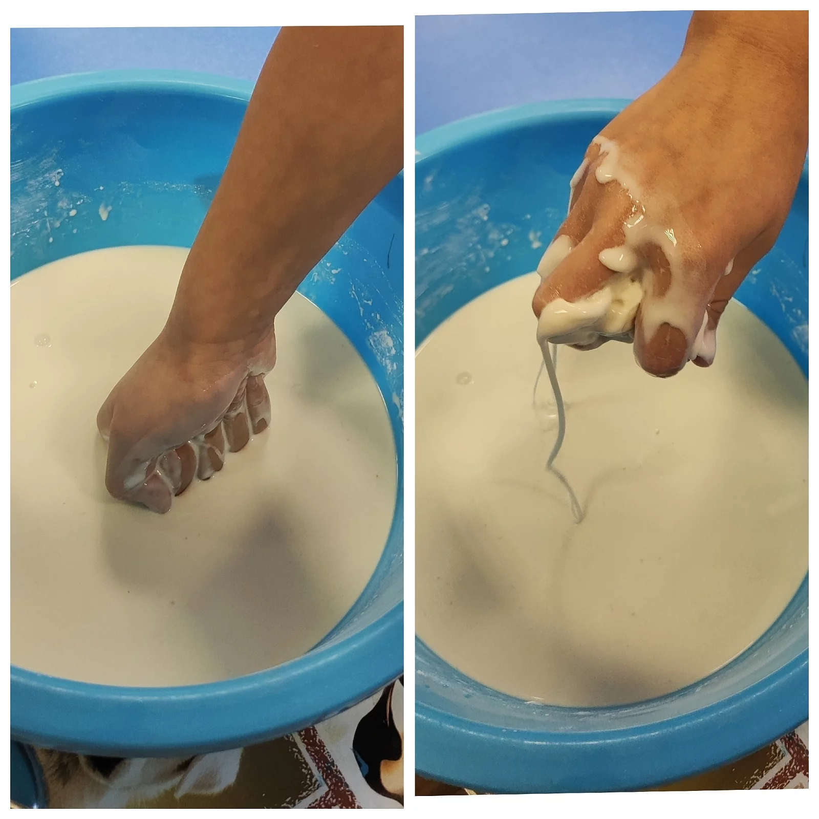 Рецепт неньютоновской жидкости из крахмала: на 2 части крахмала добавить 1 часть воды и перемешать руками.